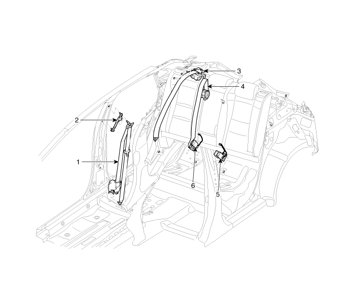 4. Rear center seat belt 5. Rear seat belt buckle [LH] 6. Rear seat belt buckle [RH] |