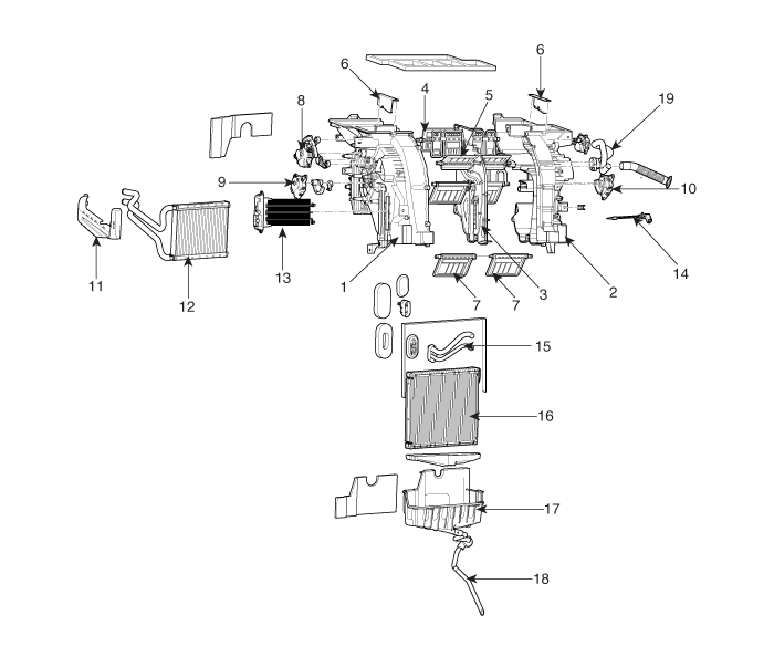 11. Heater Pipe Cover 12. Heater Core 13. PTC Heater 14. Evaporator Temperature Sensor 15. Evaporator Pipe 16. Evaporator Core 17. Heater & Evaporator Lower Case 18. Drain Hose 19. Aspirator Hose |